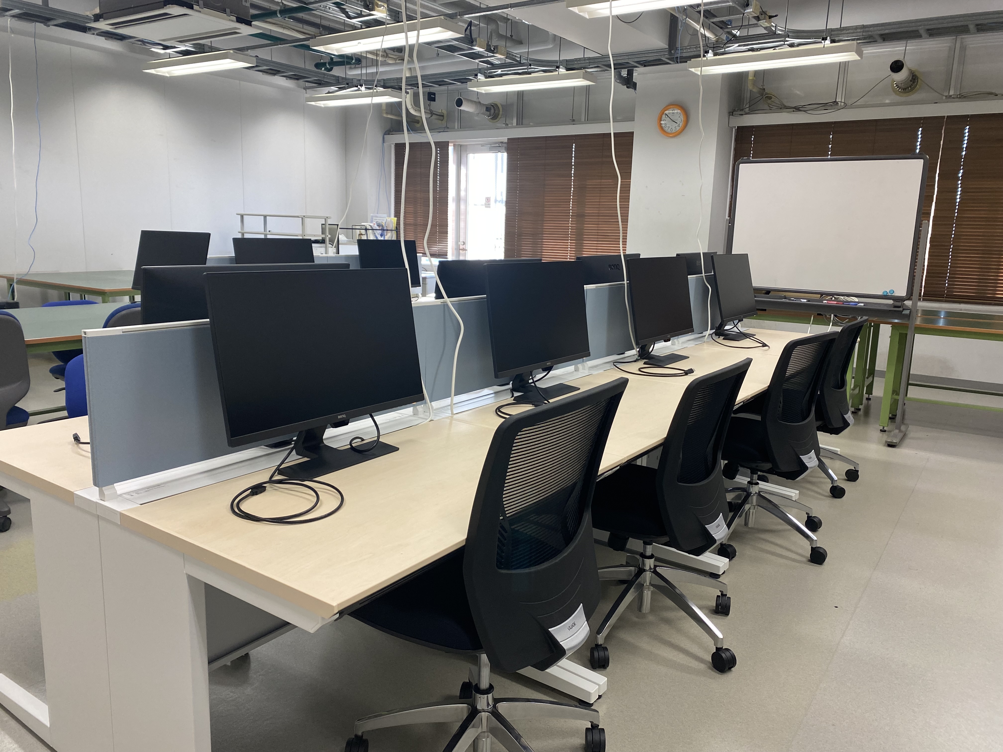 本研究室では,各自に固定席と1台のデスクトップPCが割り当てられます。またノートPCも複数所有しており,必要に応じて使うことができます。