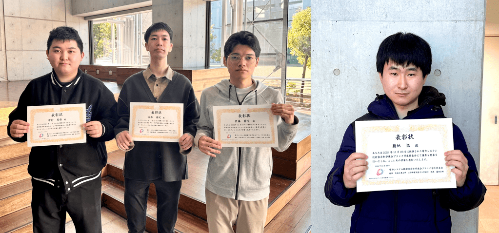 11月23日(土)に芝浦工業大学豊洲キャンパスで行われた電気学会東京私学連合ブランチ主催の卒研合同中間発表会で本研究室の学生4名(植松・菊地・佐藤(碧)・中村)が優秀発表賞を受賞しました! 受賞した4名には賞状と副賞が送られました。