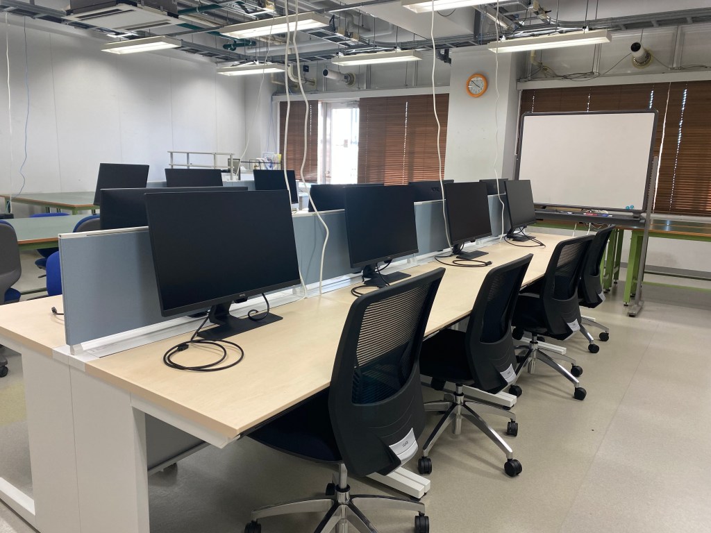 研究室には1人1台の机・デスクトップPCが割り当てられており,集中して研究に取り組める環境を整えています。また必要な学生には最新型のノートPCを貸し出しています。