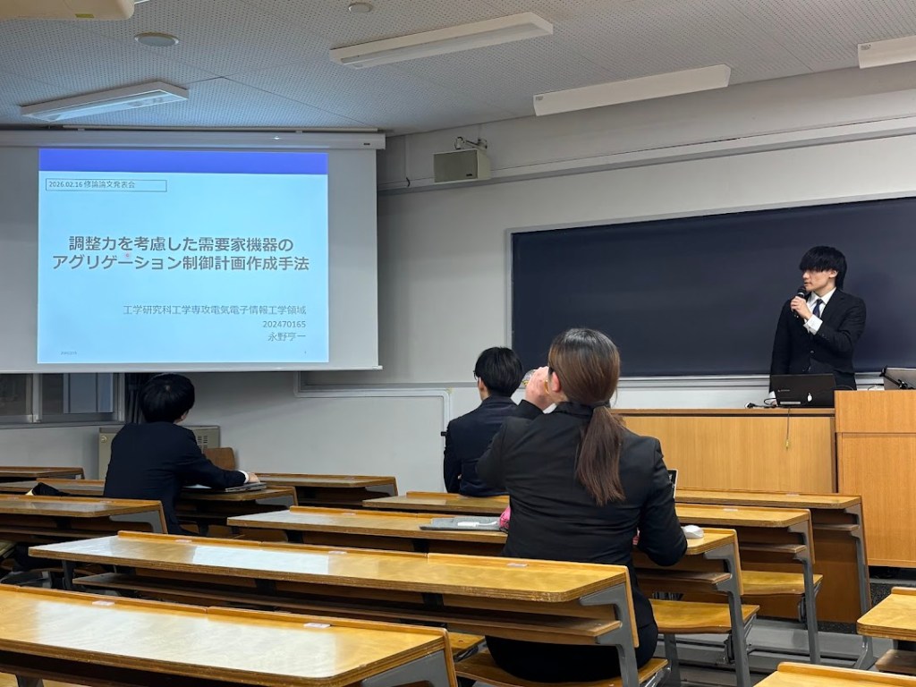 修士2年生2名が修士論文発表会で発表しました 投稿者:powersystem_KU2026年2月16日2026年3月12日カテゴリー:お知らせ 2月16日(月)に本研究室の修士2年生2名が修士論文発表会でこれまでの研究成果を発表しました。発表タイトルは以下の通りです。 井之上遥南:「電気自動車の充電需要がもたらす需給ひっ迫に関する分析」 永野亨一:「調整力を考慮した需要家機器のアグリゲーション制御計画作成手法」 関連